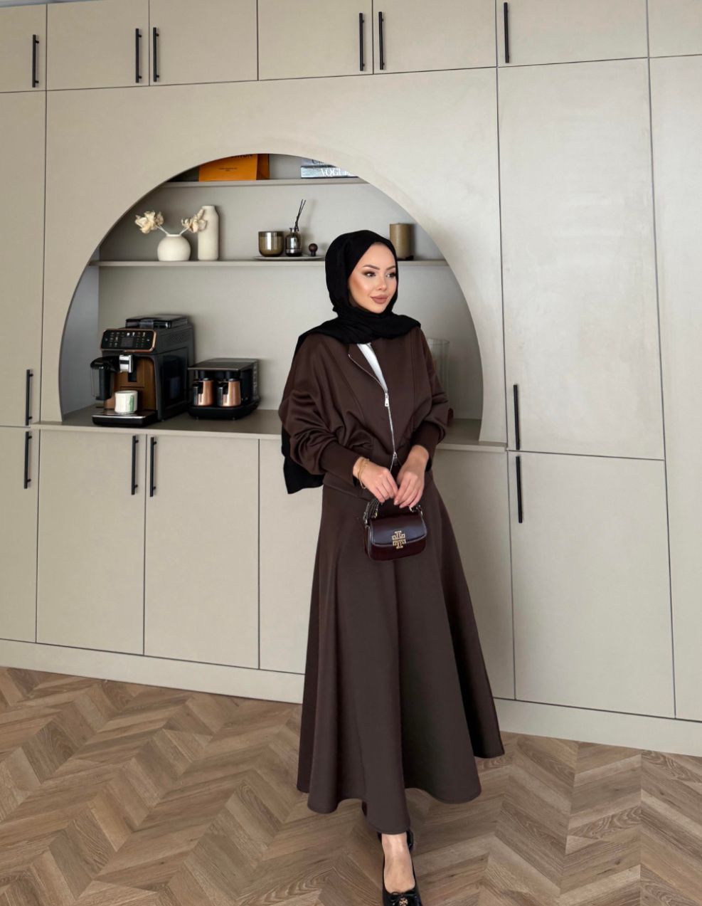 De set bestaat uit een getailleerd jasje met ritssluiting en een soepelvallende midi-rok. De rijke, diepe kleur geeft de outfit een luxe look en maakt haar veelzijdig voor zowel casual als geklede gelegenheden. Ideaal voor een chique dagelijkse outfit of een elegante avondlook.