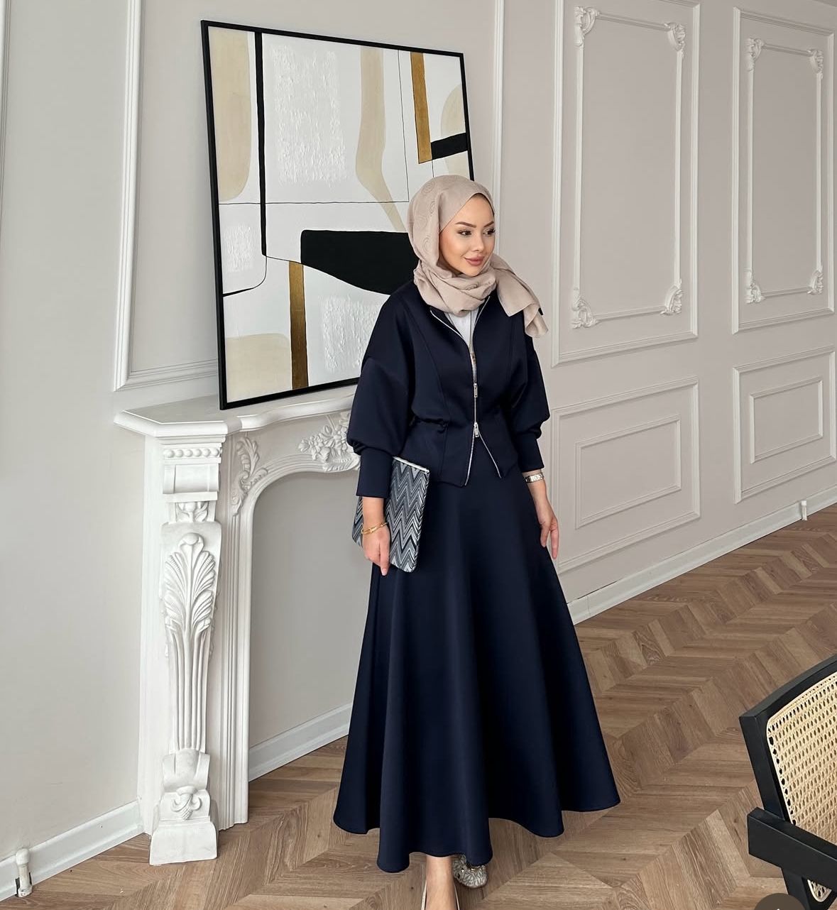 De set bestaat uit een getailleerd jasje met ritssluiting en een soepelvallende midi-rok. De diepe navy kleur geeft een luxe look en is makkelijk te combineren voor zowel casual als geklede gelegenheden. Perfect voor een chique dagelijkse outfit of een elegante avondlook.